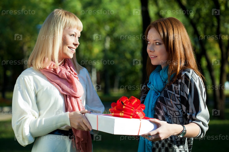 Две сестры с подарком в парке