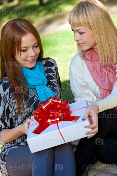 Две сестры с подарком в парке