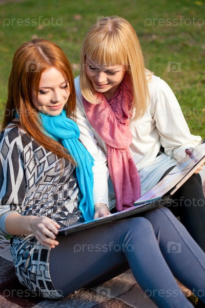 Две сестры смотрят фотоальбом в парке