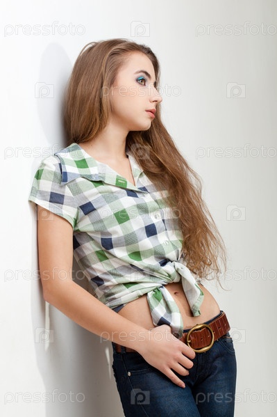 Красивая девушка в джинсах и клетчатой рубашке