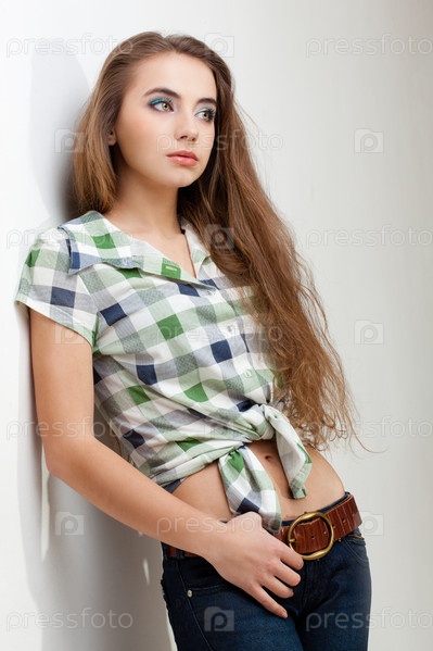 Красивая девушка в джинсах и клетчатой рубашке
