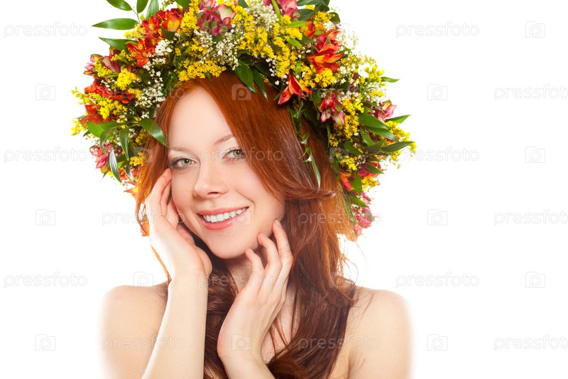 Счастливая шатенка с цветочным венком на голове