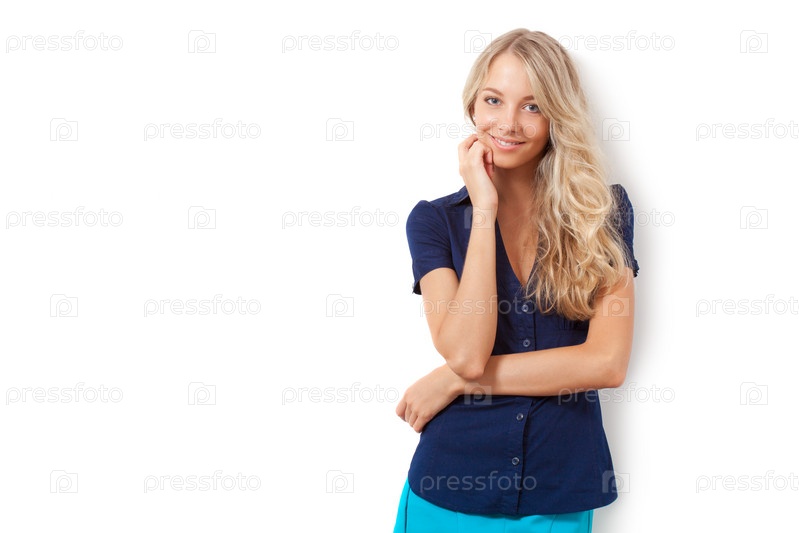 Женщина-блондинка у белой стены