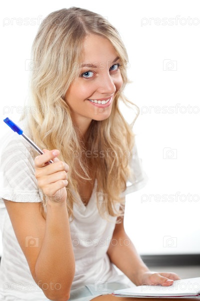 Блондинка с ручкой и тетрадью в руках
