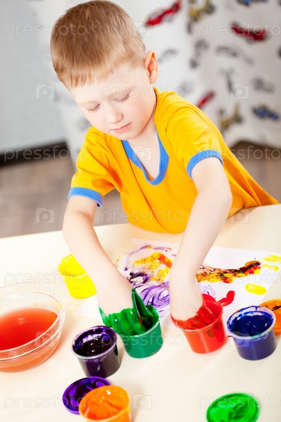 Мальчик рисует руками