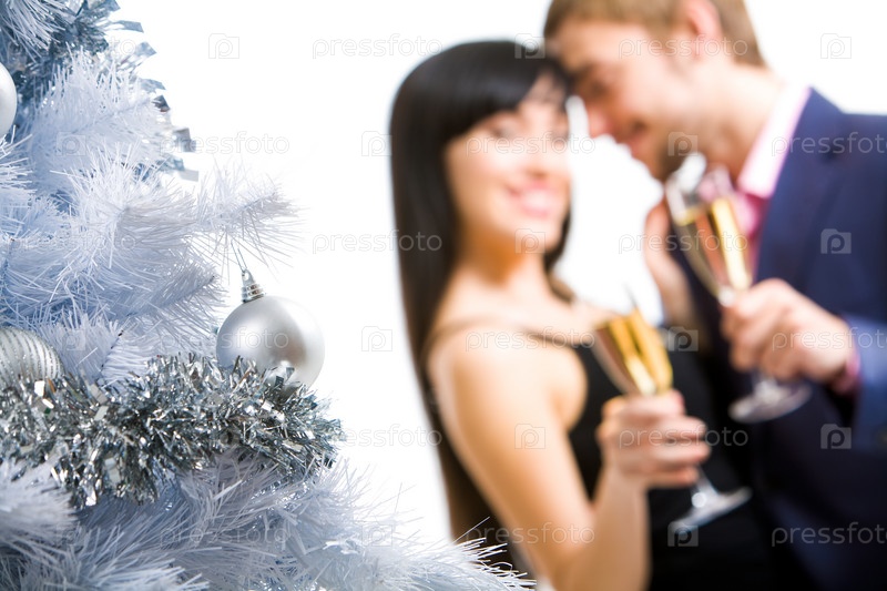 Часть праздничной новогодней елки украшена серебряными гирляндами и игрушечными шарами на фоне счастливой пары