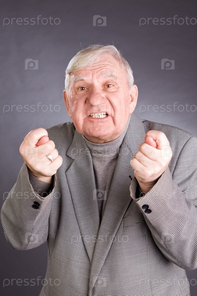 Пожилой человек в сером костюме показывает фиги