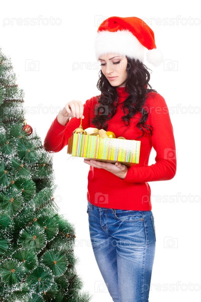 Женщина украшает новогоднюю елку