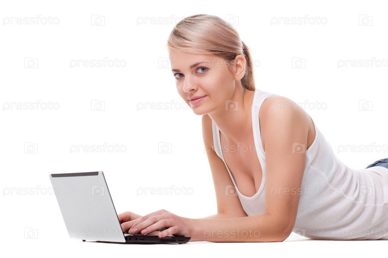 Женщина лежит на полу с ноутбуком