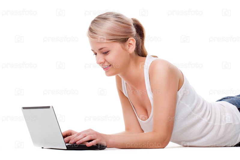 Женщина лежит на полу с ноутбуком