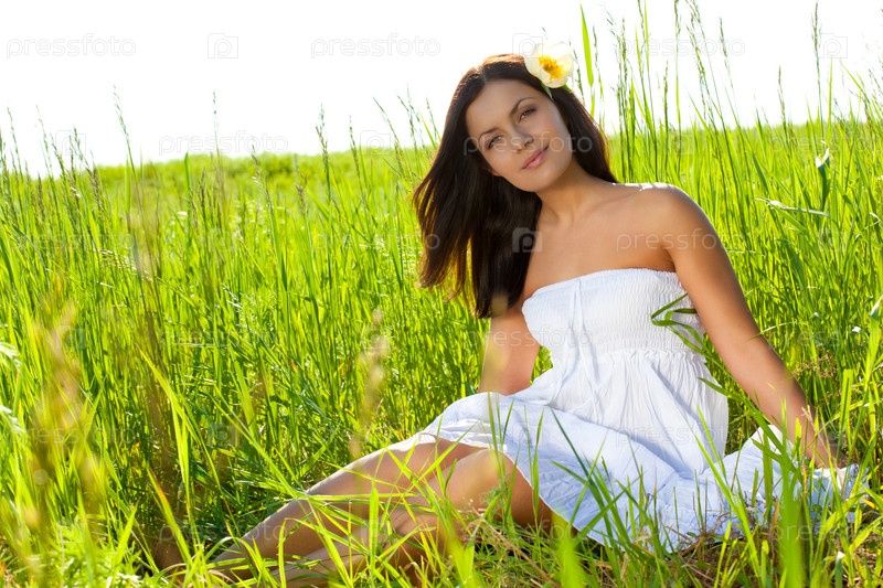 Женщина сидит на зеленом поле