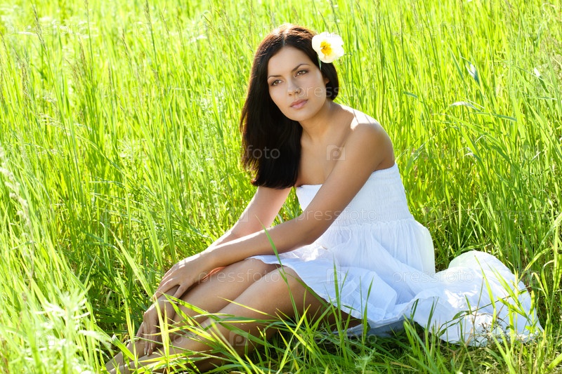 Женщина сидит на зеленом поле