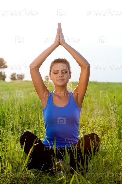 Женщина в позе лотоса на поле