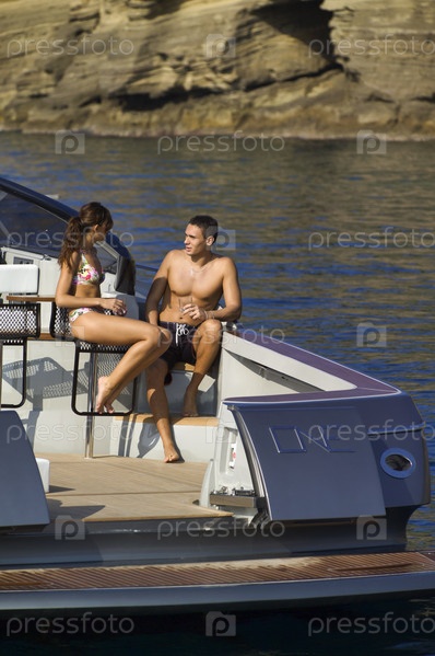 Италия, Байя (Неаполь), одна из роскошных яхт (верфь: Кантьери ди Байа), молодая пара отдыхает на борту