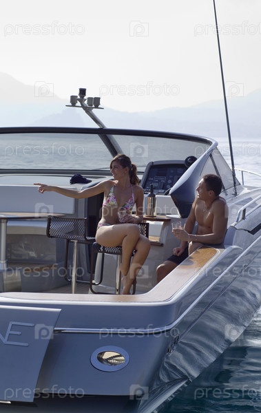 Италия, Байя (Неаполь), молодая пара отдыхает на борту роскошной яхты (верфь Кантьери ди Байа)