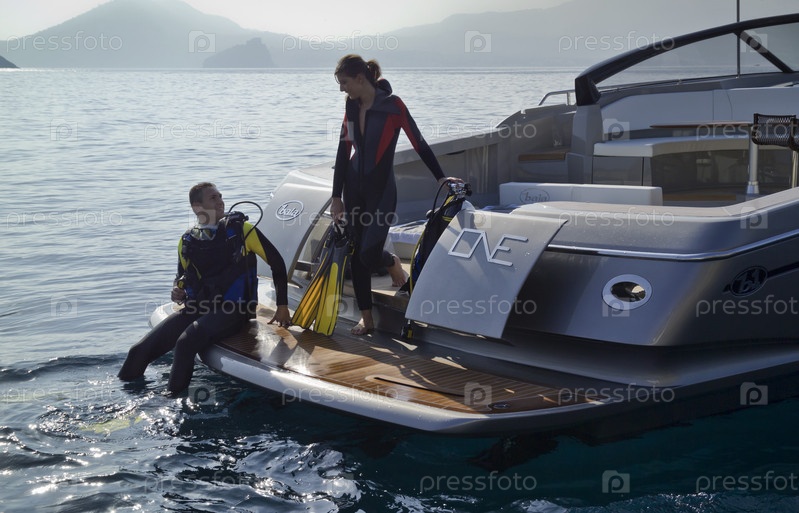 Италия, Байя (Неаполь), молодая пара готова к погружению на борту роскошной яхты (верфь Кантьери ди Байя)