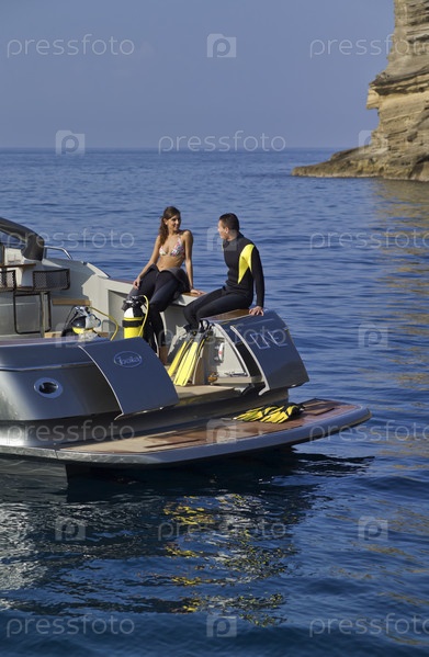 Италия, Байя (Неаполь), молодая пара готова к погружению на борту роскошной яхты (верфь Кантьери ди Байя)