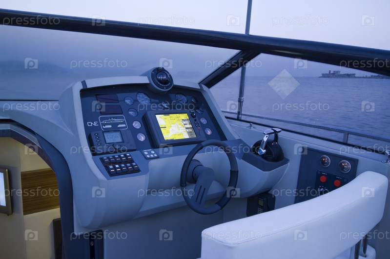 Италия, Байя (Неаполь), роскошная яхта (верфь Кантьери ди Байя), рубка и панель управления на закате