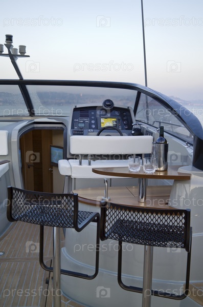Италия, Байя (Неаполь), роскошная яхта (верфь Кантьери ди Байя), рубка и панель управления на закате