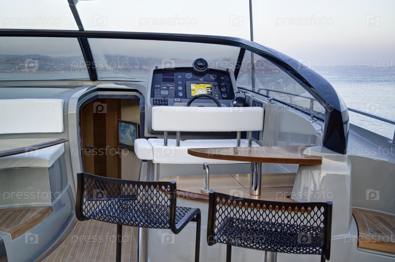 Италия, Байя (Неаполь), роскошная яхта (верфь Кантьери ди Байя), рубка и панель управления на закате