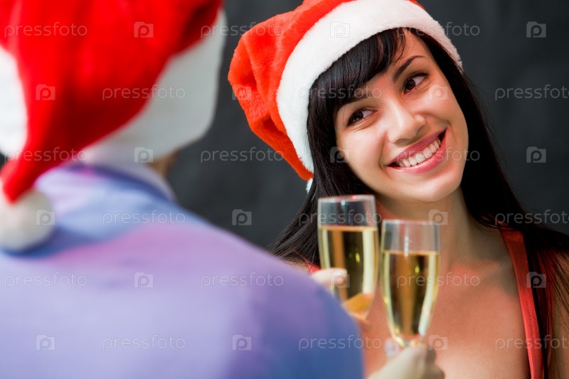 Изображение счастливой женщины с шампанской флейтой, которая смотрит на мужчину и улыбается