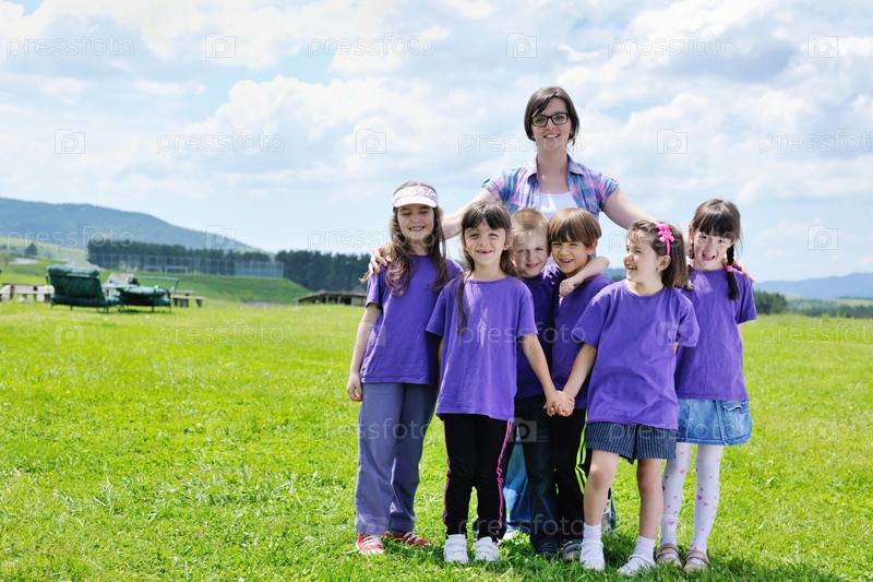 Счастливые дети с учителем на природе
