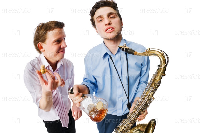 Два молодых мужчины с выпивкой и саксофоном