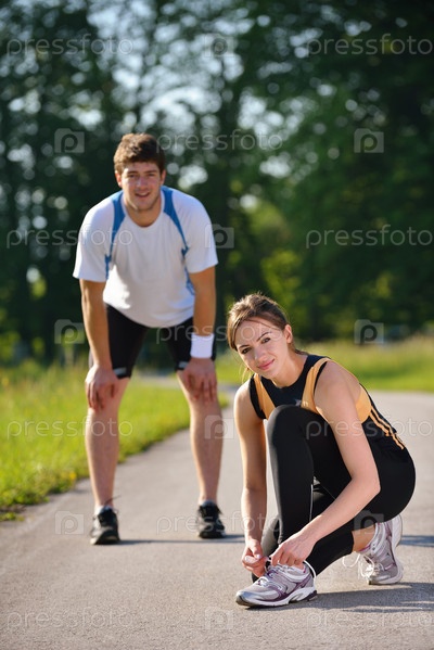 Пара делает растяжку после бега