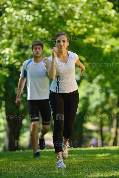 Молодая пара бегает трусцой