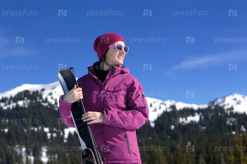 Женщина с лыжами зимой