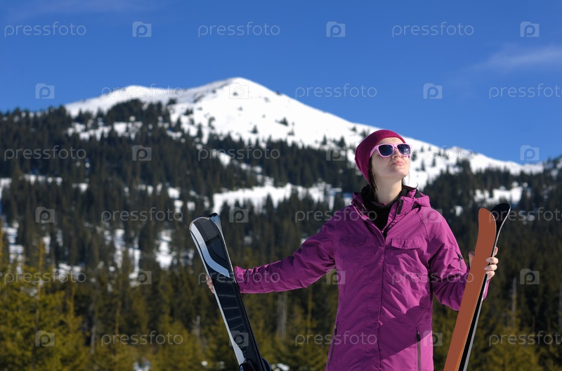 Женщина с лыжами зимой
