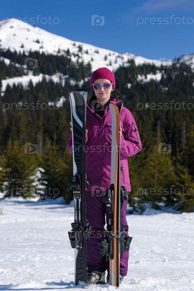Женщина с лыжами зимой