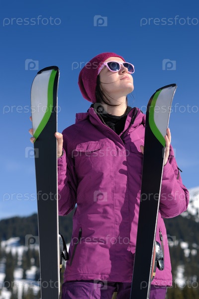 Женщина с лыжами зимой