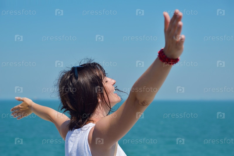 Счастливая молодая женщина стоит, подняв руки к небу