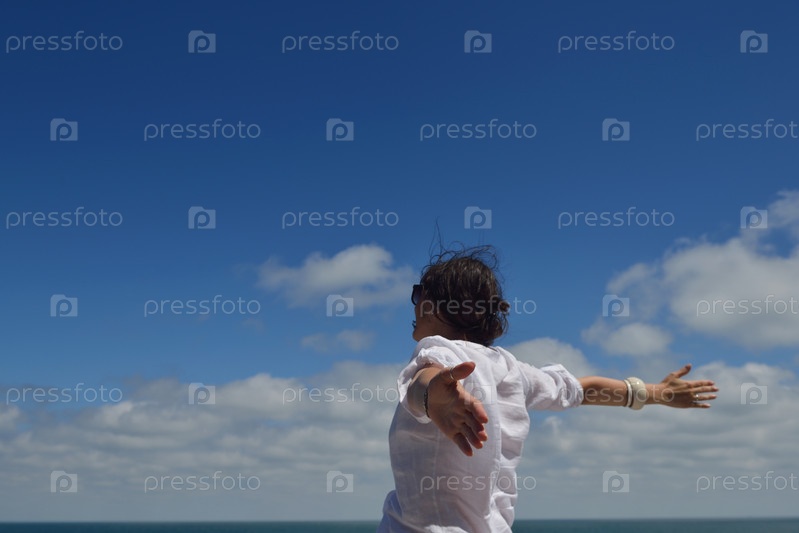Счастливая молодая женщина стоит, подняв руки к небу