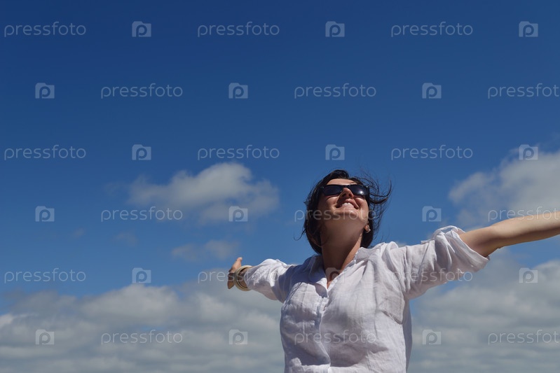 Счастливая молодая женщина стоит, подняв руки к небу