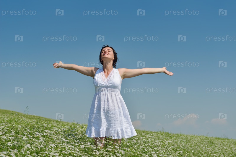 Молодая счастливая женщина на зеленом поле