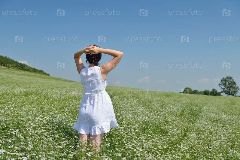 Молодая счастливая женщина на зеленом поле