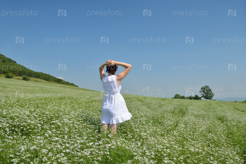 Молодая счастливая женщина на зеленом поле