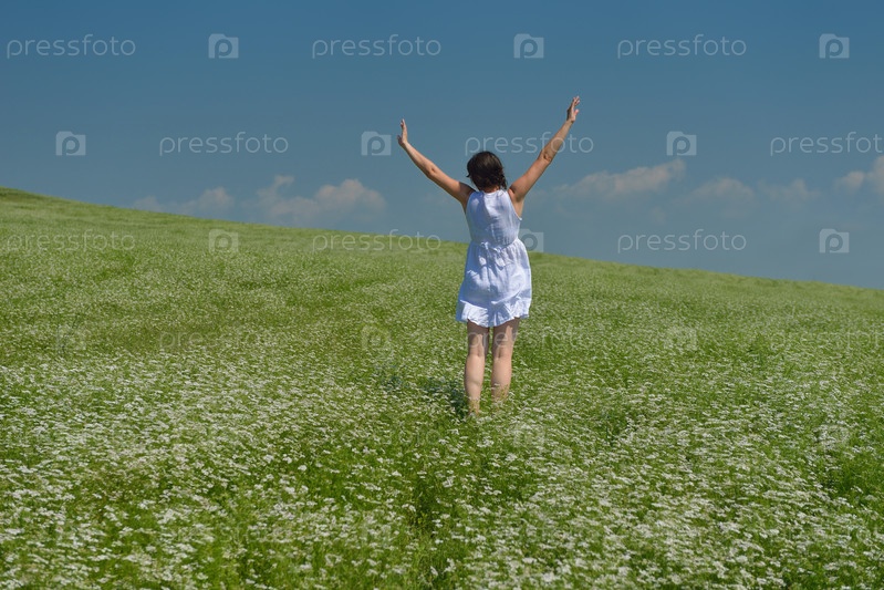 Молодая счастливая женщина на зеленом поле