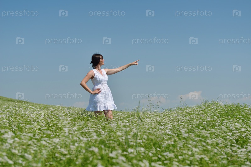 Молодая счастливая женщина на зеленом поле