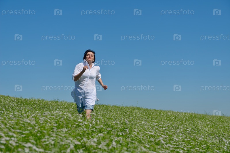 Молодая счастливая женщина на зеленом поле