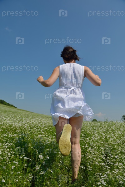 Молодая счастливая женщина на зеленом поле