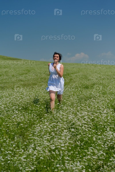 Молодая счастливая женщина на зеленом поле