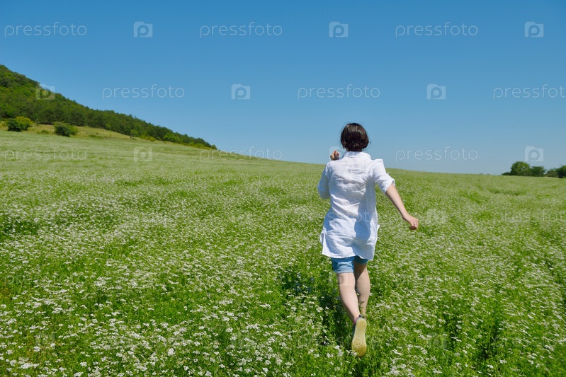 Молодая счастливая женщина на зеленом поле