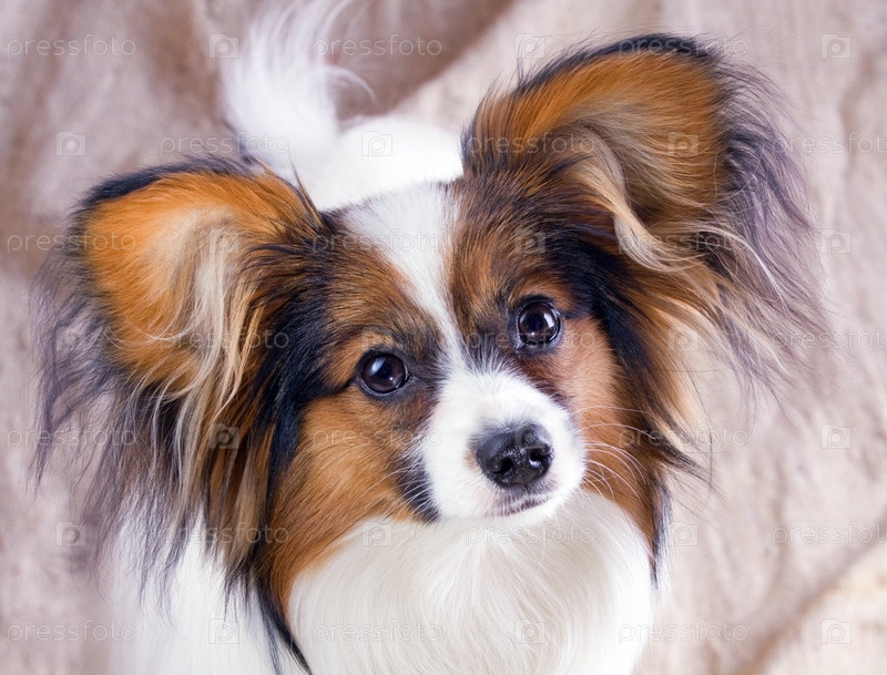 Собака породы "папиллон" на белом фоне