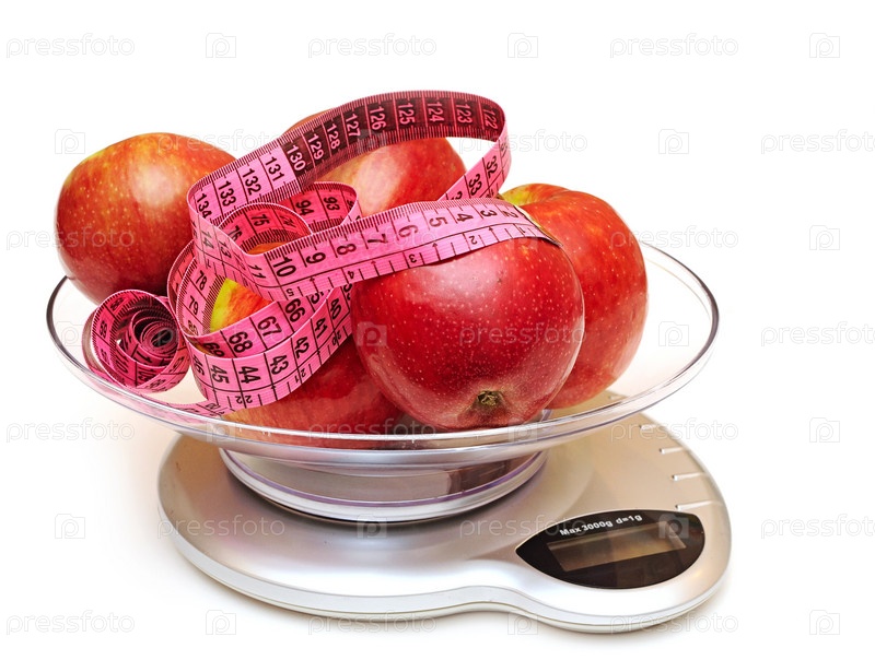 Красные яблоки и измерительная лента на электронных весах. Концепция диеты