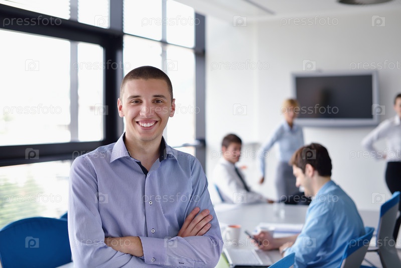 Бизнесмен на встрече в офисе с коллегами на заднем плане