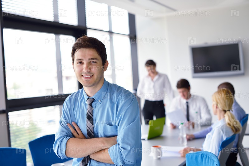 Бизнесмен на встрече в офисе с коллегами на заднем плане