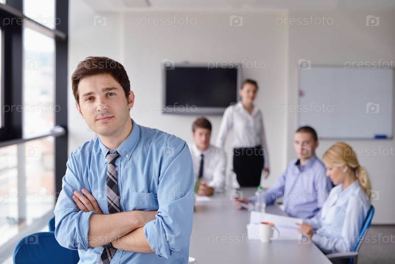 Бизнесмен на встрече в офисе с коллегами на заднем плане